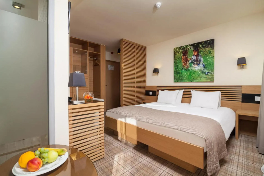 Here’s what you’ll find in the room to have a rest after a long day: a shower, a TV, a mini-bar, a bathrobe and slippers. The room equipment depends on its category.